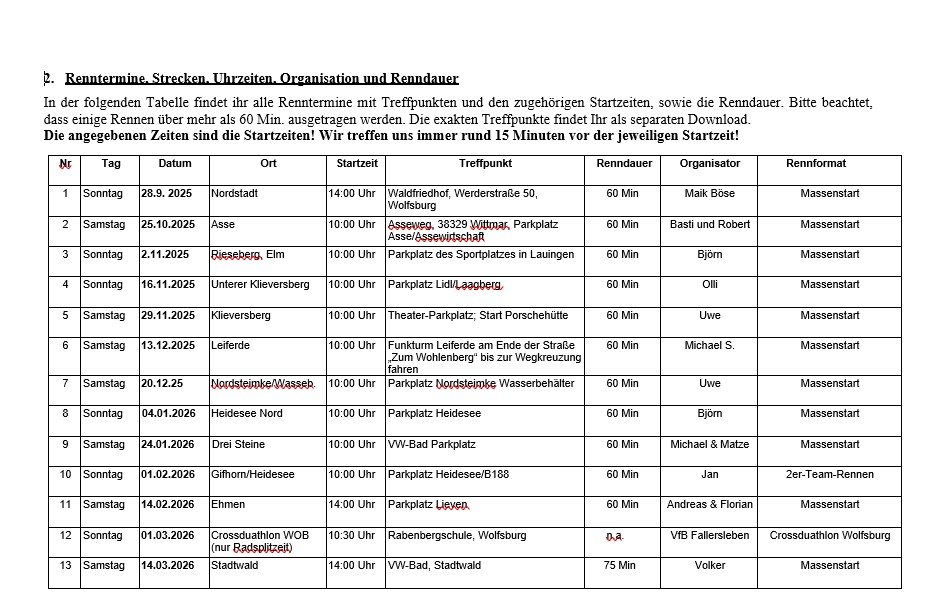 Die Wintertrainingsrennserie des MTB Team Wolfsburg besteht in der Saison 25/26 vorerst aus insgesamt 13 Rennen, die auf unterschiedlichen Strecken (s. u.) ausgetragen werden.