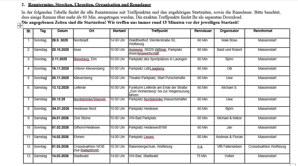 In der folgenden Tabelle findet ihr alle Renntermine mit Treffpunkten und den zugehörigen Startzeiten, sowie die Renndauer. Bitte beachtet, dass wieder einige Rennen über mehr als 60 Min. ausgetragen werden.